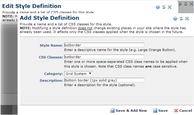 This dialog includes a Save & Add New button to make it easy to register multiple styles at once. Note the warning in the dialog. Editing an existing style cannot change styling already applied, it only affects future styling.