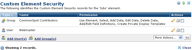 Once you assign privileges and close, the Custom Element Security dialog refreshes to display the new user or group and permissions.