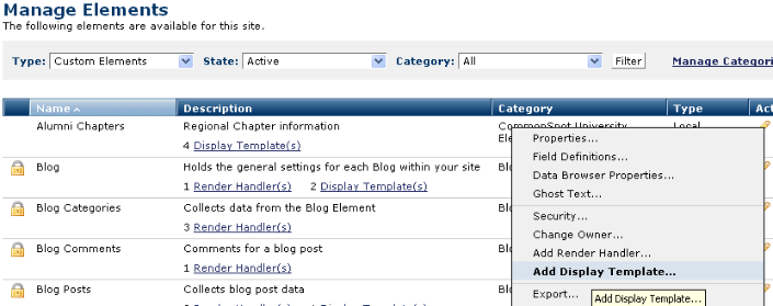 To add a new display template click the edit icon for a Custom Element and select Add Display Template. To view or edit an existing display template, click the associated Display Template(s) link in the Description column for a Custom Element.