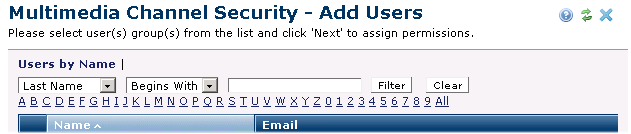 Access this dialog by clicking Add User(s) in the Multimedia Channel Security dialog to grant new users access to the current channel.