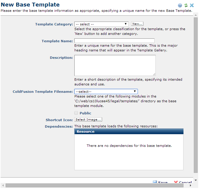 Click Add New Base Template in the Base Templates dialog. The New Base Template dialog prompts for information necessary to register a new Base Template. Complete the following fields to create a new Base Template. This dialog displays in edit mode for existing Base Templates.