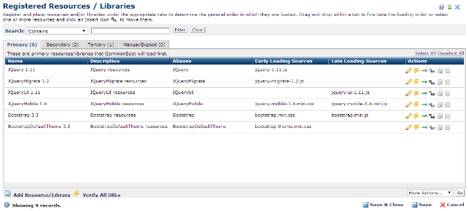 Each resource consists of a name, description, a set of resource URLs, along with distribution rights information, and optional aliases for loading it. Resources load their files (Resource URLs) into one of three Resource Groups - Primary, Secondary, and Tertiary, which reflect load order within the categories of Early (<head> section) or Late (just before the </body> tag) displayed here