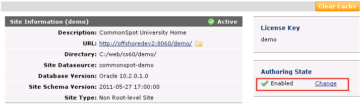 to display the Subsite Listing dialog.Authoring State: Enables/disables site-wide authoring. You (or a scheduled process) can temporarily disable authoring within all sites or a given subsite. Use this option for periodic site maintenance.You need to disable authoring for site upgrades, migration or database conversion. Options here are identical to those available for setting the server-wide authoring state, but affect the current site/subsite only. See Authoring State for details on using this option.