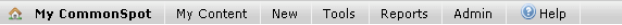 CommonSpot menu bars contain a set of functions for quickly accessing, viewing, and managing content. The top-level gray menu bar is always available for quick access to the My CommonSpot dashboard, personalized content, new content creation, and standard tools and reports.