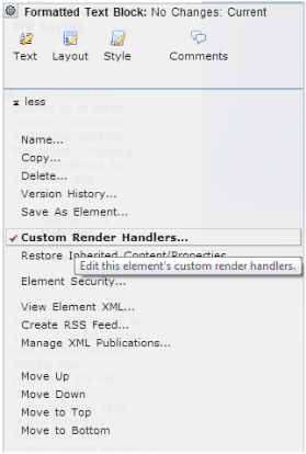 icon for an instance of that type, displays the Custom Render Handlers option within the Element dropdown, as shown below for the Formatted Text Block Element.
