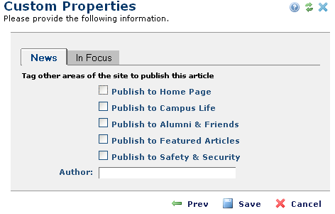 Designers, administrators, or developers typically define Image metadata. Click Save to update metadata, Prev to return to the Upload Image dialog or Cancel to exit without saving,