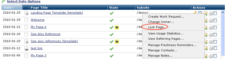 Choose Actions – Lock Page to enable/disable other users from editing the current page.