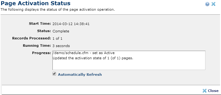 This dialog displays when you choose the activate option for multiple pages from My Pages or other reports. The activation process reports status for each page selected.