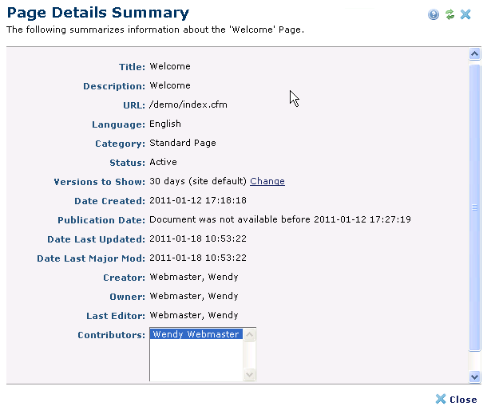 This dialog displays information entered through the Create Page or Standard Metadata dialogs, as well as status and change state for the current page. See Create Page. See also Page Details.