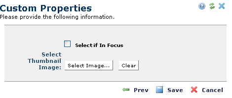 For example, in the site using the form above, thumbnail representations are associated with uploaded documents to easily identify them. This custom properties form prompts for selecting a thumbnail image during new document upload.