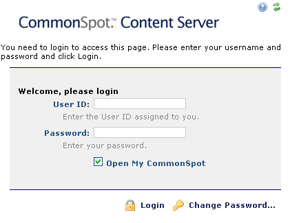 Once you enter your User ID and Password (and optionally check My CommonSpot) click Login to view pages in CommonSpot.