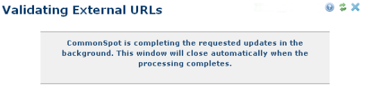 This dialog displays when you select this option in the Submit Entire Element for Publication dialog and click Submit. If all links resolve, this window closes after the following message displays.