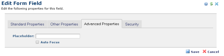 Click the Advanced Properties tab to set field focus and enter helpful placeholder text in the field.