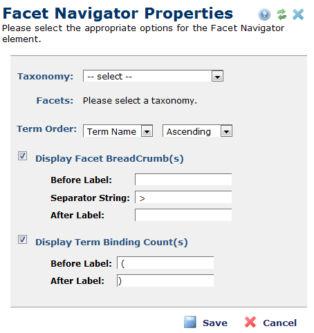 The Facet Navigator Properties dialog options let you choose a taxonomy and the facets that display for navigation. The fields are as follows: